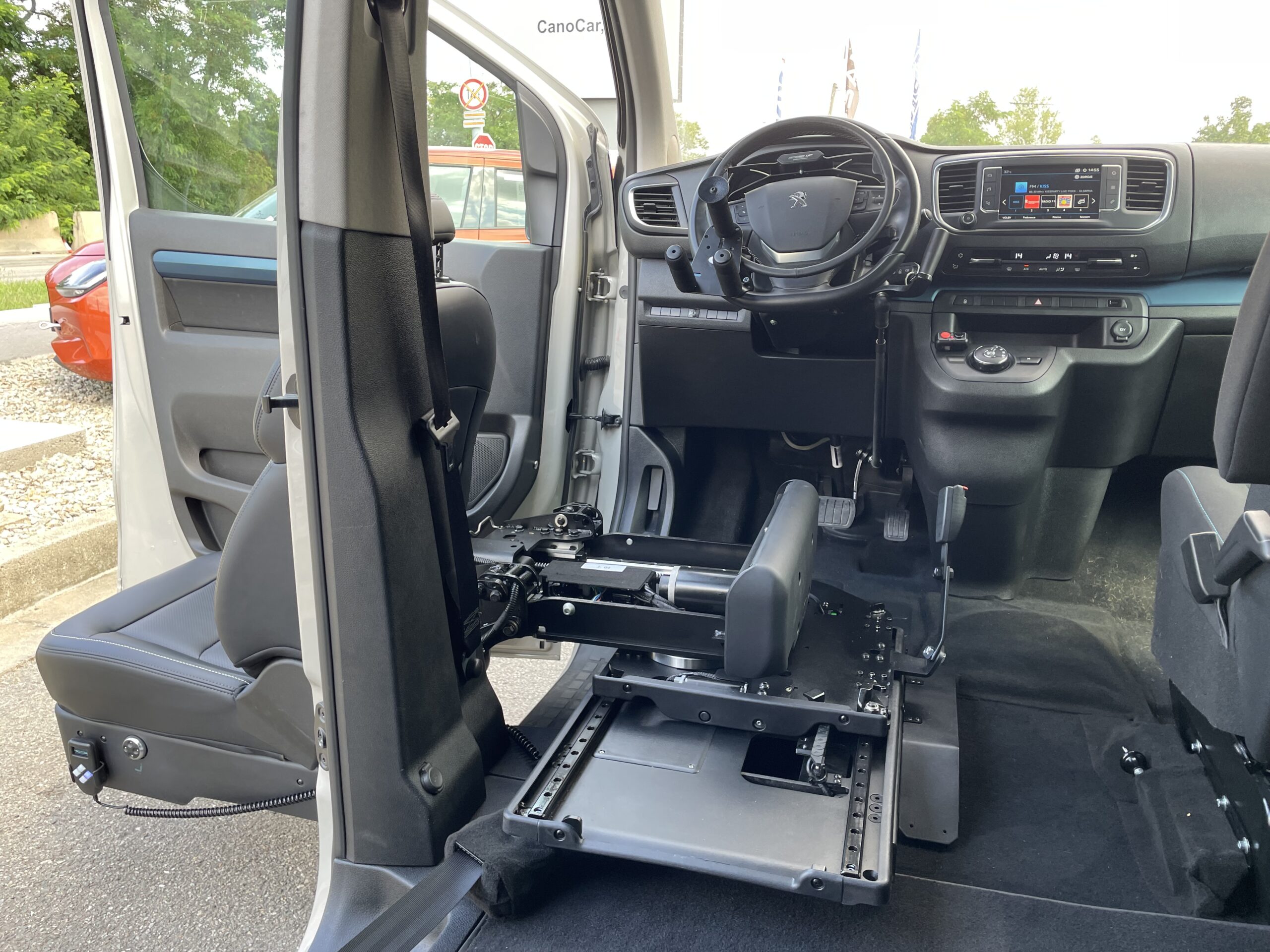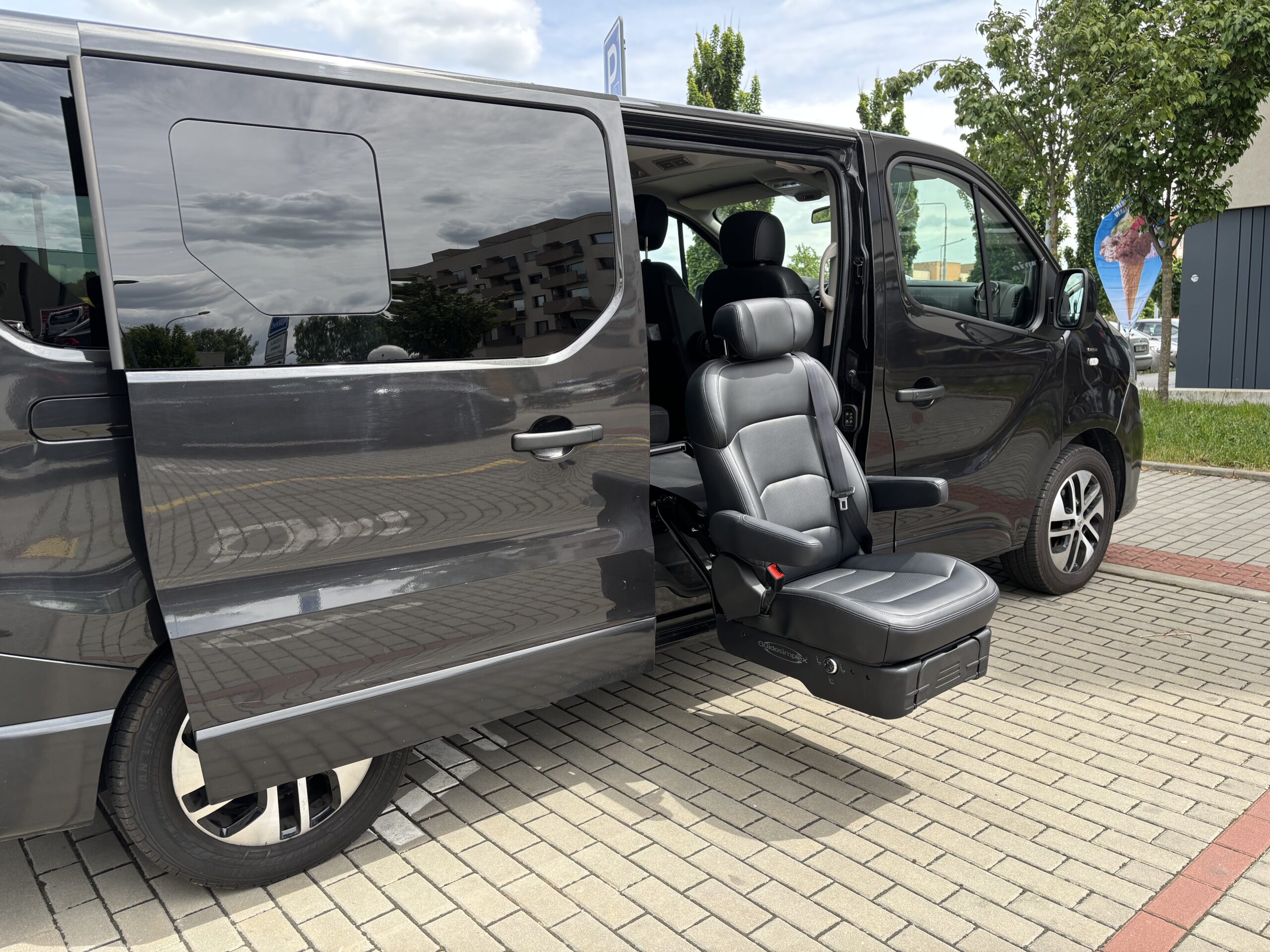 Speciální otočné zařízení vysune sedačku ven z vozidla a spustí ji do požadované výšky pro nastupování a vystupování. Úprava se provádí u sedadla spolujezdce nebo u sedadel u dveří v druhé řadě na levé či pravé straně. Ve výjimečných případech lze systém instalovat i na místo řidiče. Elektrický mechanismus se ovládá pomocí drátového dálkového ovladače nebo přes aplikaci v telefonu pomocí Bluetooth.